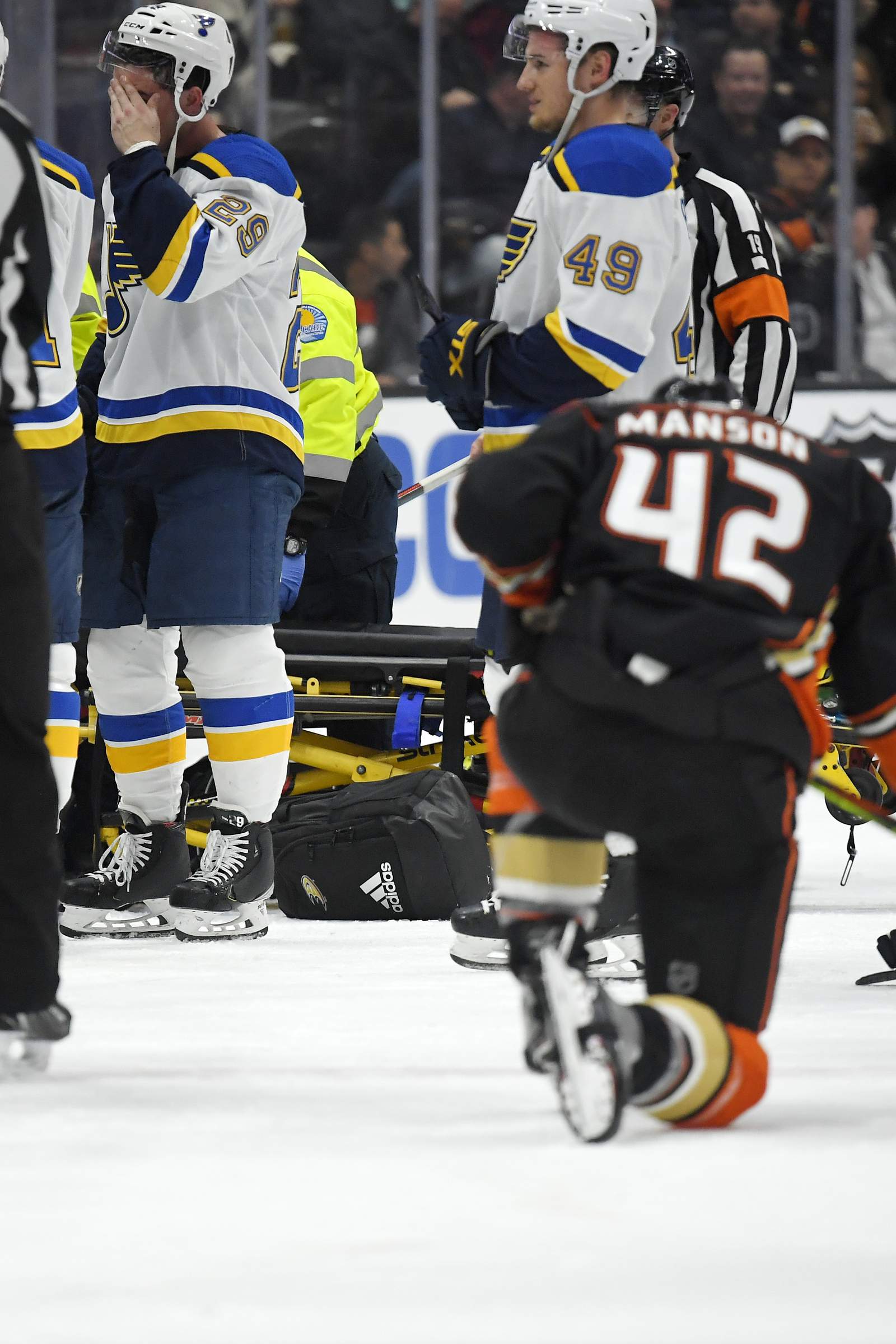 Blues Bouwmeester Remains Hospitalized After Bench Collapse